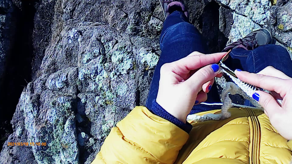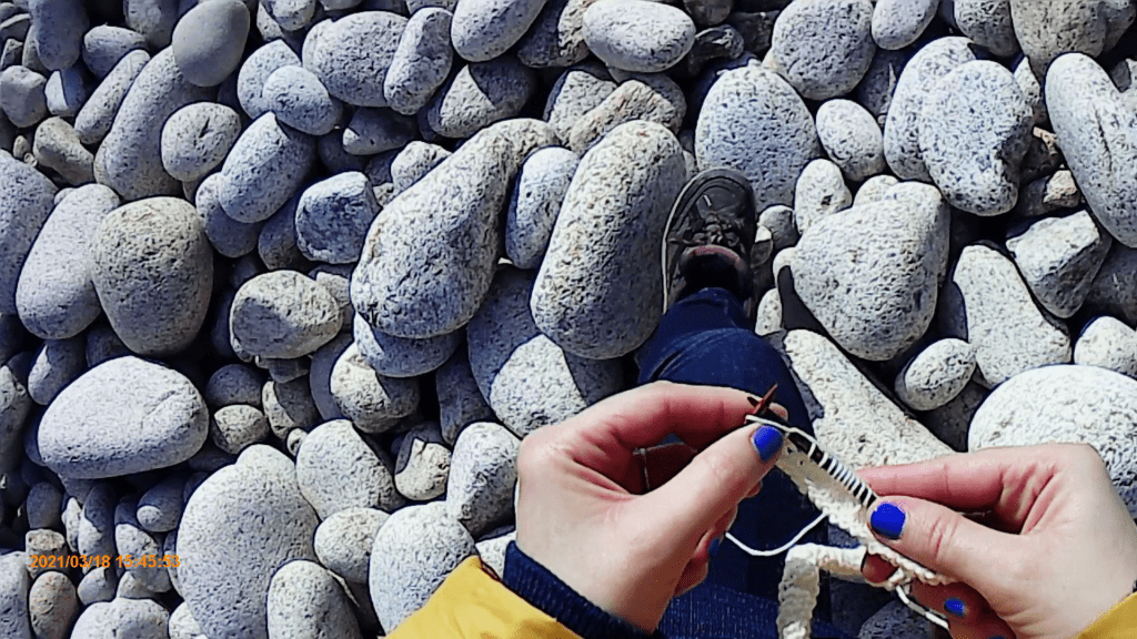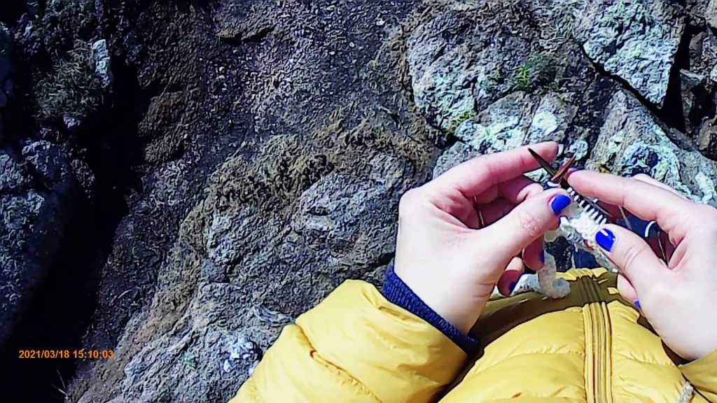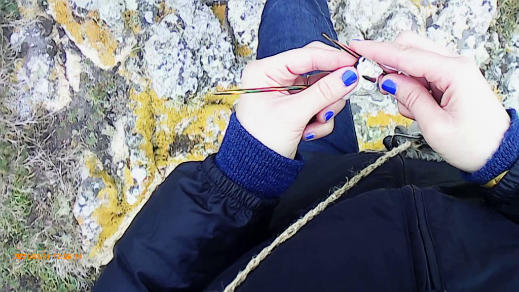 Marcher, tricoter, filmer. Mesurer les distances en mailles, tricoter le paysage, inscrire le geste dans le terrain. Combiner mouvement des jambes et mouvement des doigts. Garder une trace textile de la marche, documenter. Réfléchir au double avancement.