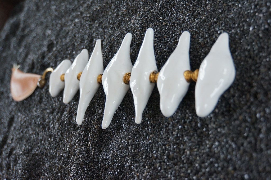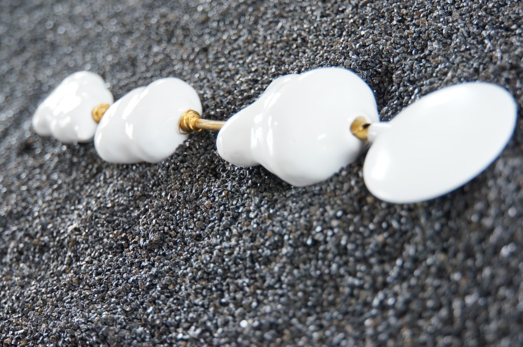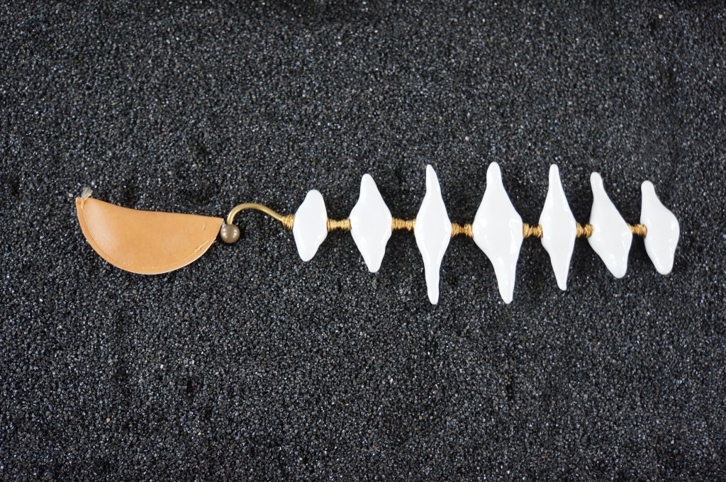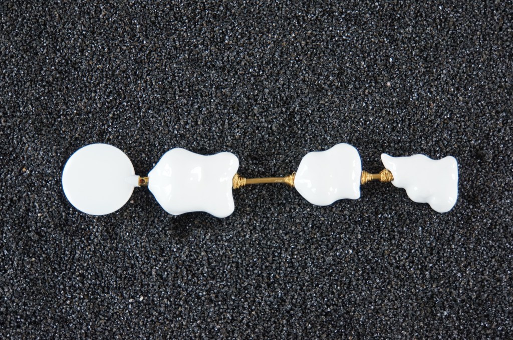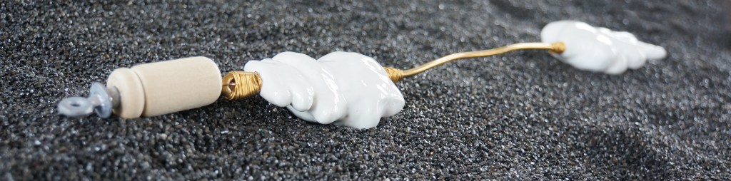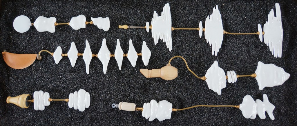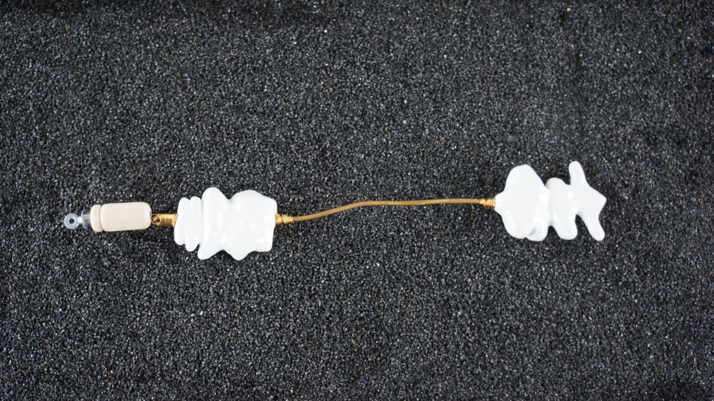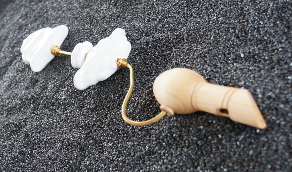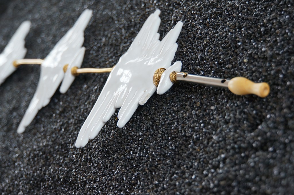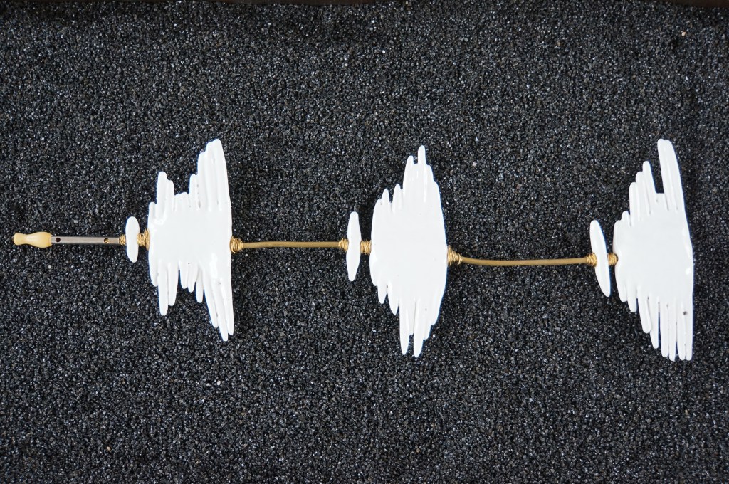 Appeaux, faïence émaillée, laiton, chêne, quartz noir / 155 x 52 x 100 cm / 2013