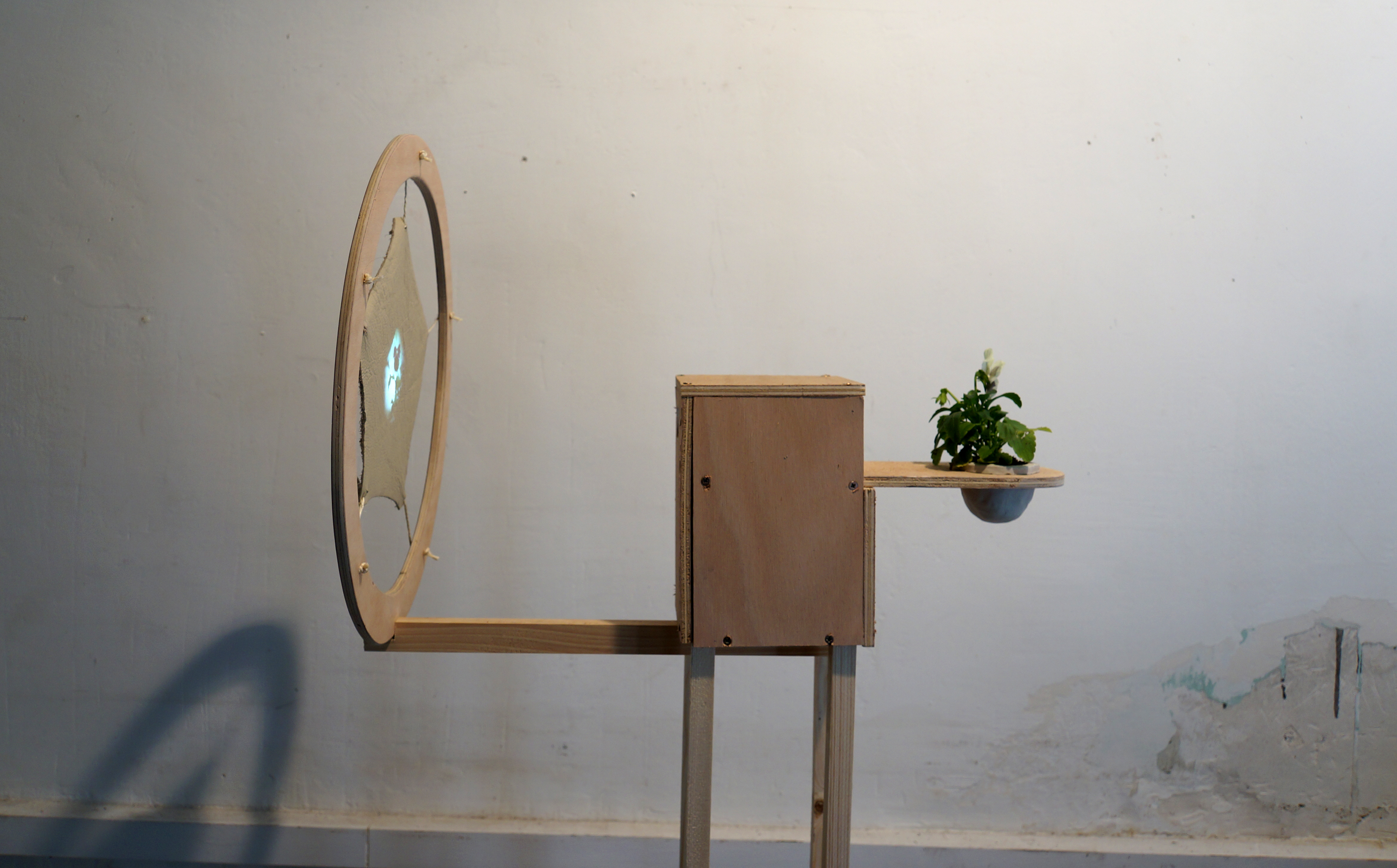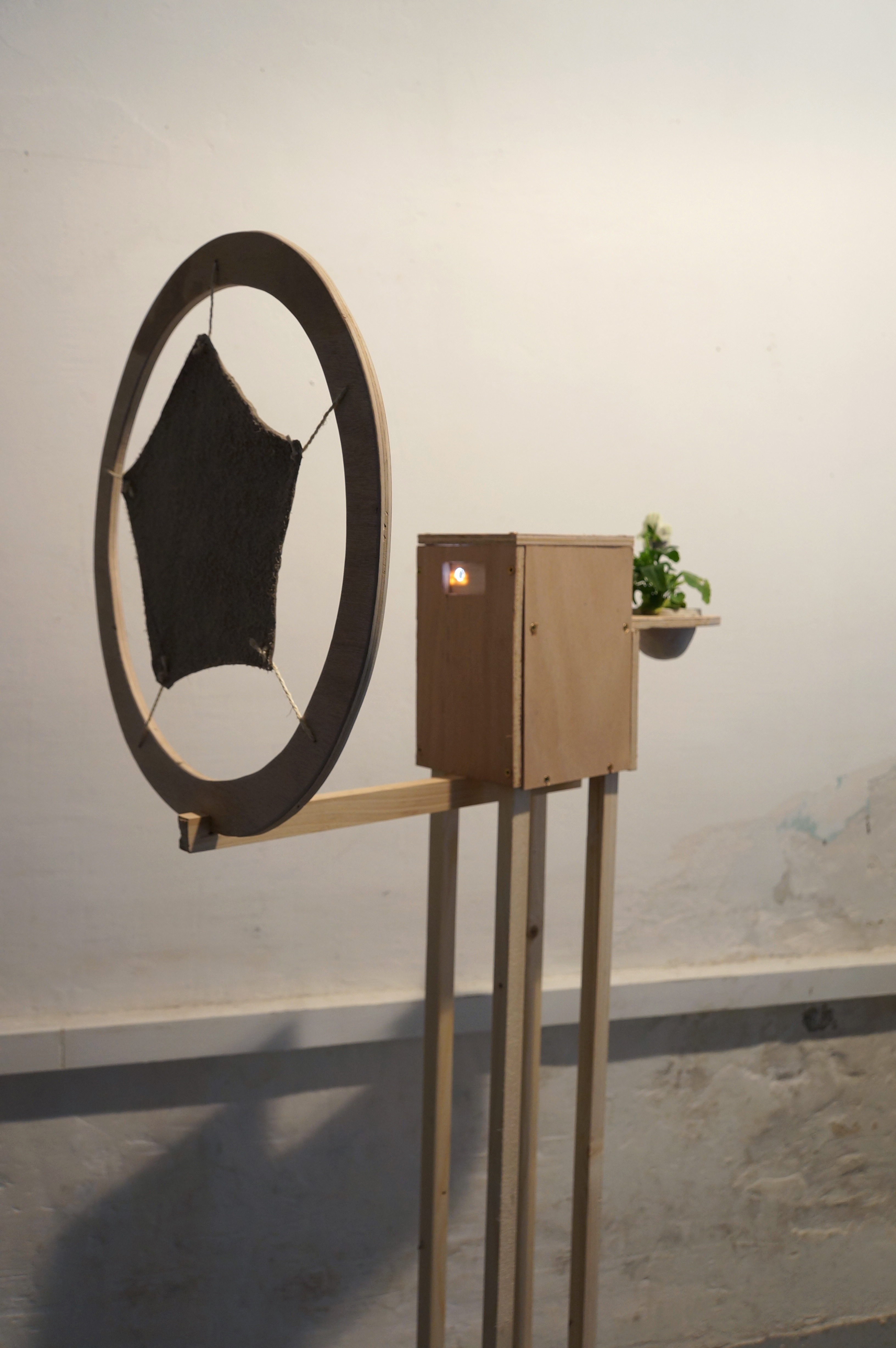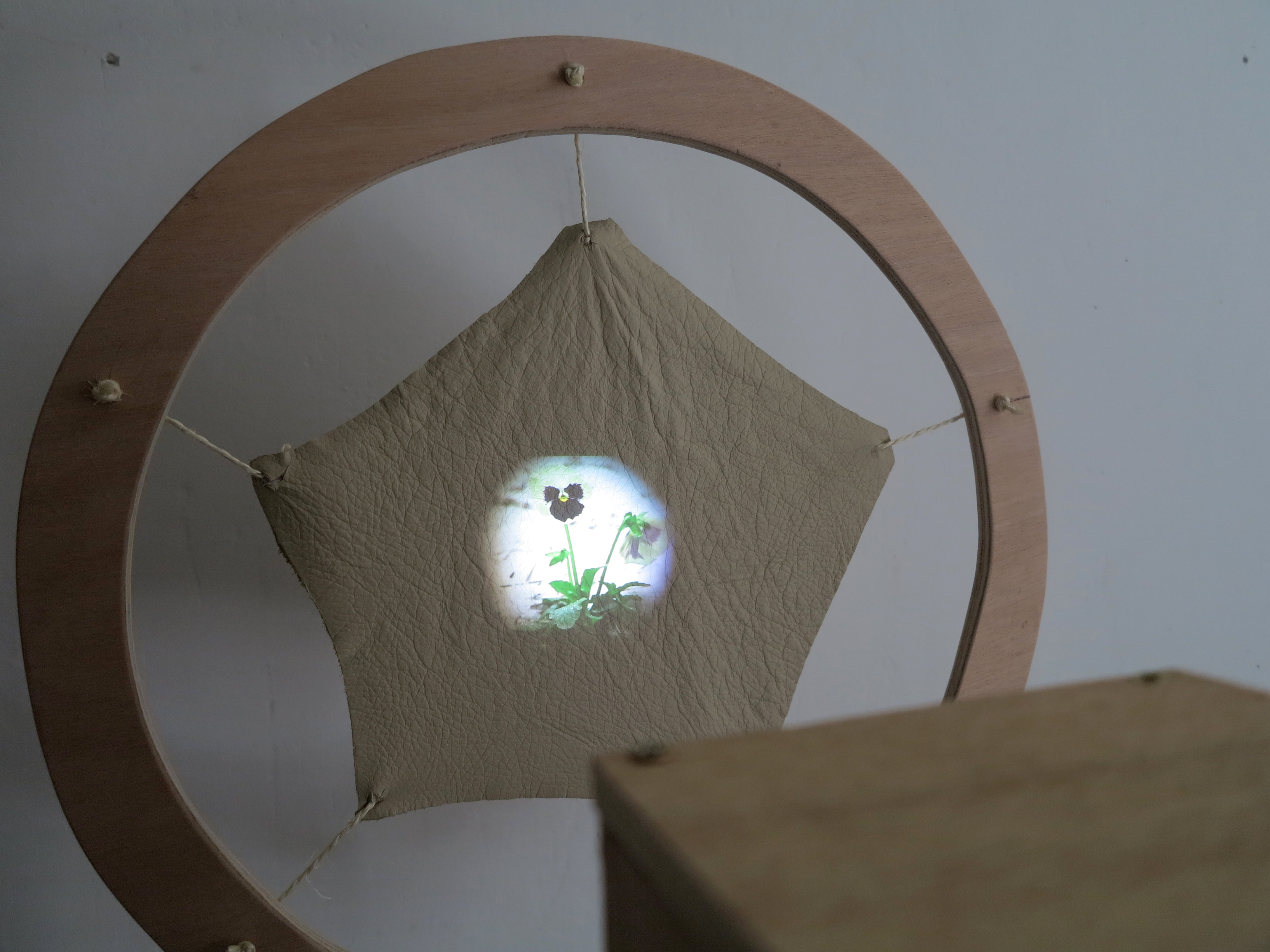 Vidéoprojection, cuir, ficelle, bois, argile crue, terreau, pensée / 150 x 45 x 65 cm / 2014